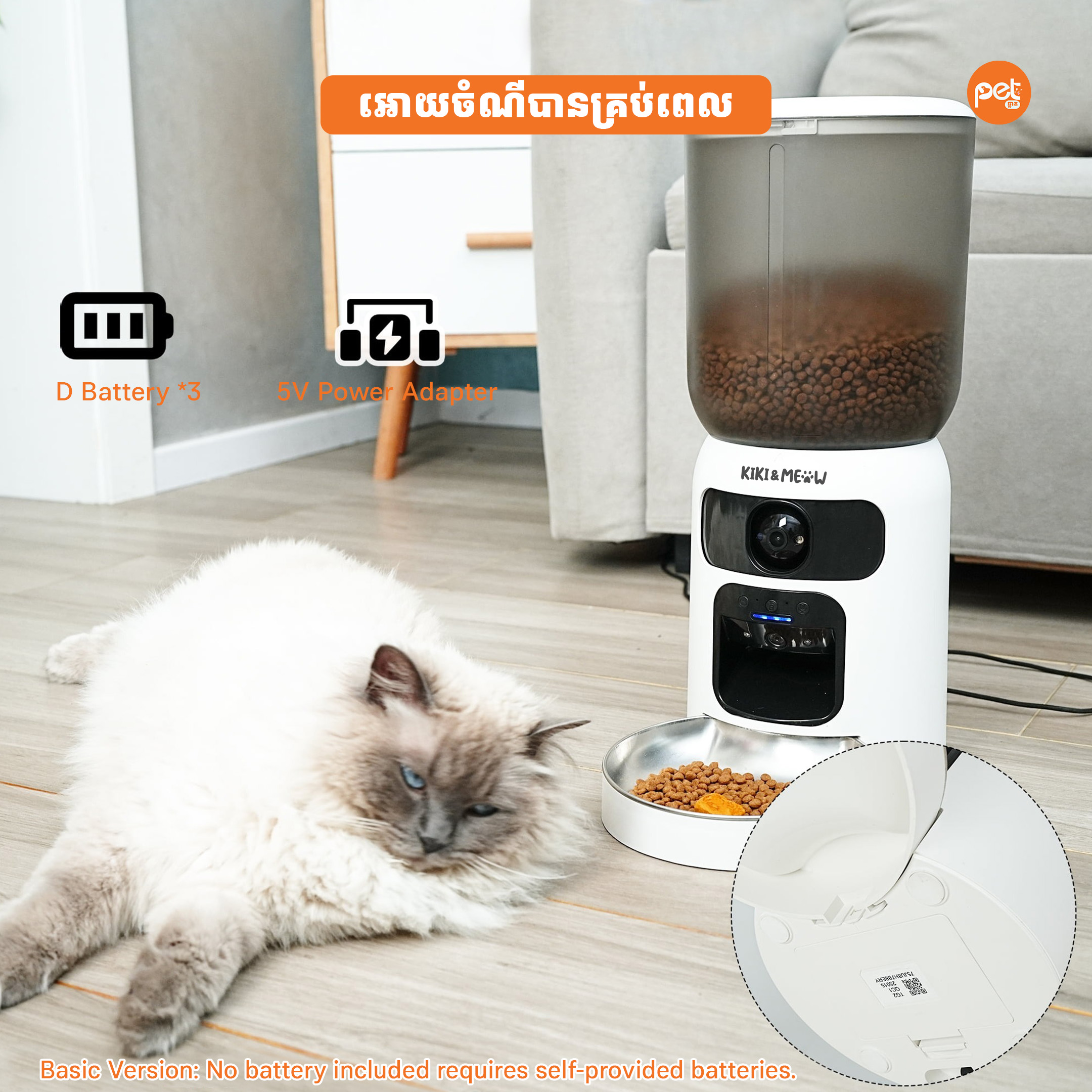 Dual Power Protection: Operates with a $5\text{V}$ power adapter but also supports three D batteries as a backup to ensure your pet is fed even during a power outage.