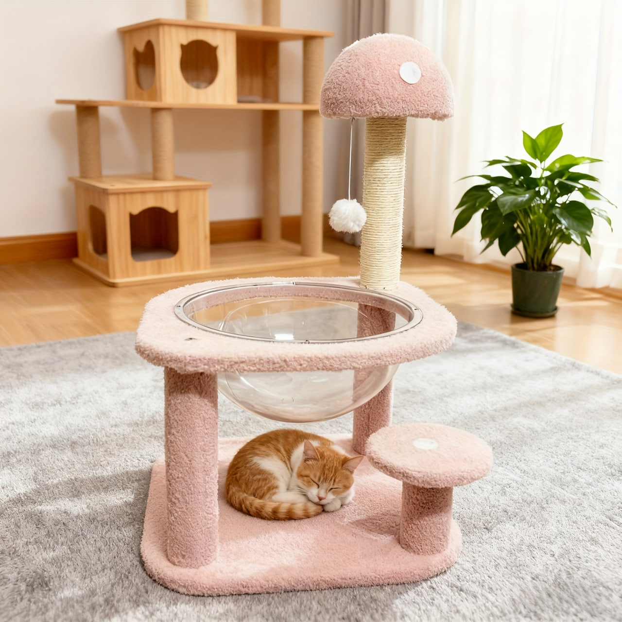 Bring a touch of whimsical charm to your home with the Mushroom-Themed Luxury Cat Tree. This multi-functional activity center is designed to satisfy your cat’s natural instincts to climb, scratch, and observe—all while providing a uniquely cozy resting spot in its signature transparent “space capsule” bed.